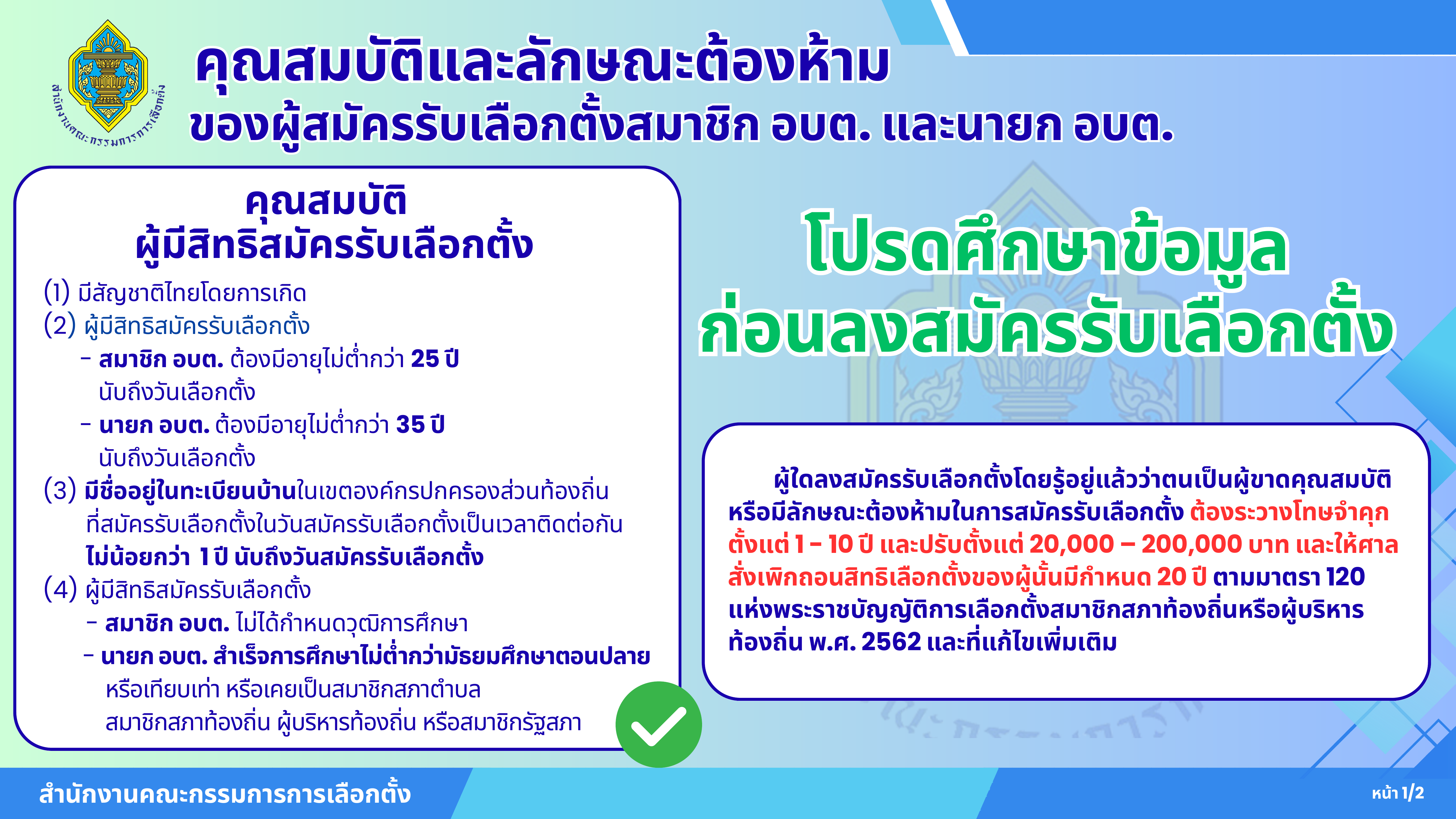 ประชาสัมพันธ์คุณสมบัติและลักษณะต้องห้ามของผู้สมัครรับเลือกตั้งสมาชิกสภาองค์การบริหารส่วนตำบล และนายกองค์การบริหารส่วนตำบล |